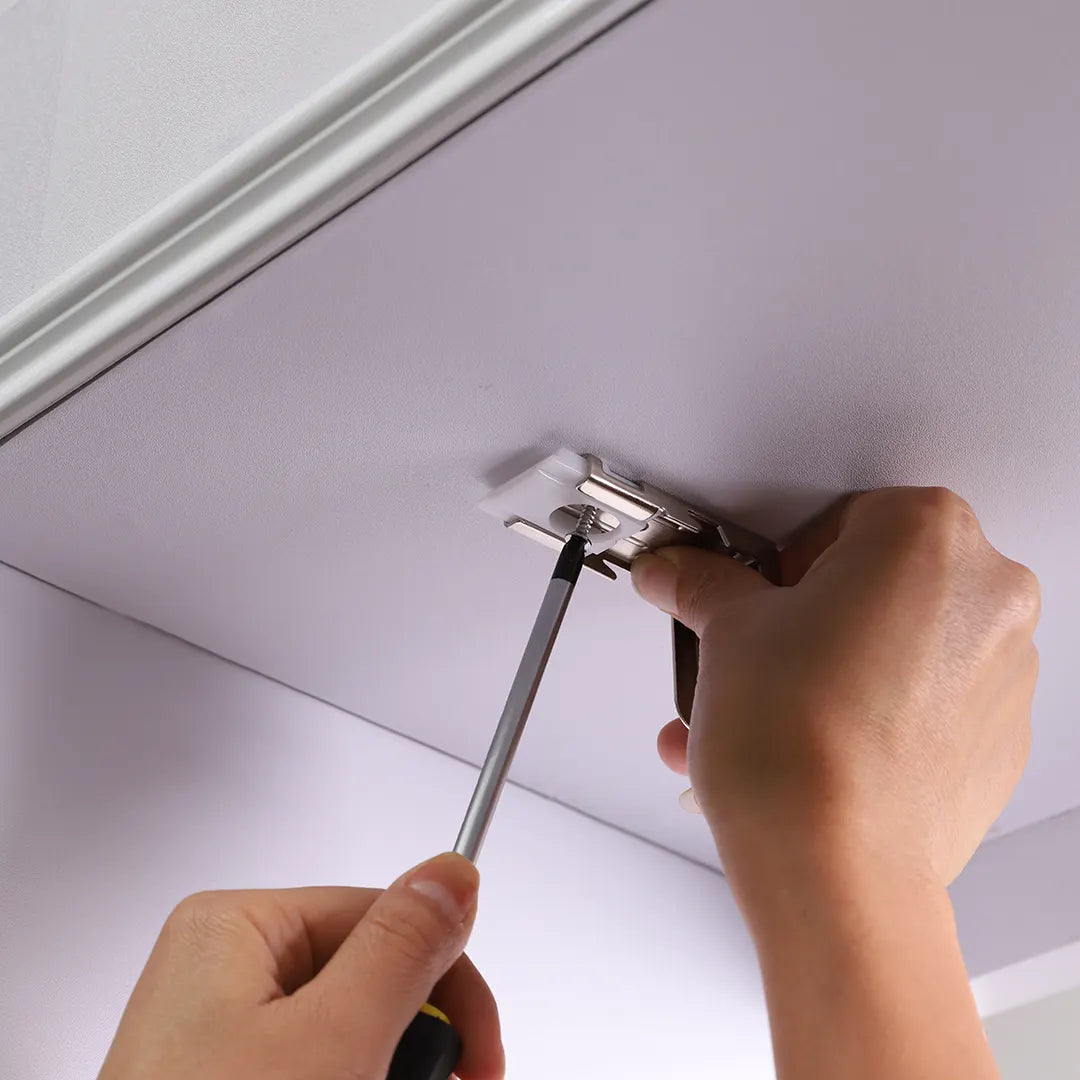 Use a power drill to make the holes, then secure the brackets in place with a screwdriver.